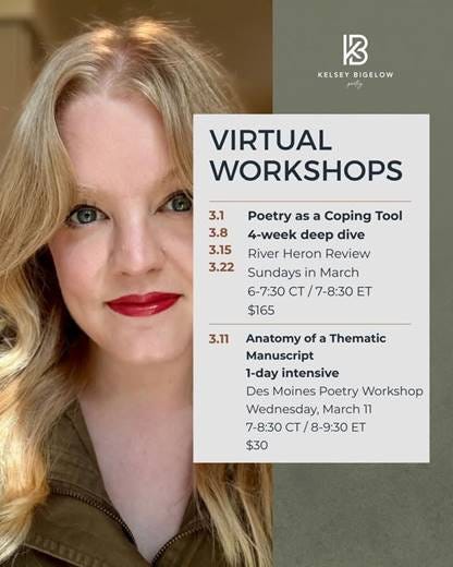 Kelsey Bigelow has become one of Iowa’s shining poetry stars. Experienced beyond belief, a tireless practitioner of her craft, and a relentless advocate for helping others embrace the beauty and importance of poetry, Kelsey has created two opportunities for poets yearning to improve their own abilities. “Poetry as a Coping Tool” is a 4-week workshop, and “Anatomy of a Working Manuscript” is a one-day intensive workshop.