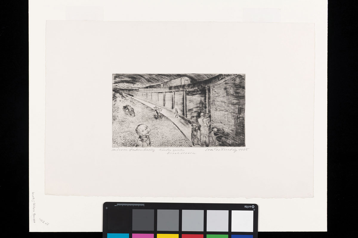 Lea Grundig (German, 1906-1977), Kinder spielen Erschießen (Children Play War), plate 4 from the series “Unterm Hakenkreuz (Under the Swastika)”, 1934, Drypoint on paper, Sheet: 13 1/8 × 19 7/8 in. (33.3 × 50.5 cm.), Plate (/image): 5 3/8 × 9 13/16 in. (13.7 × 24.9 cm.), Des Moines Art Center Permanent Collections; Purchased with funds from the Edmundson Art Foundation, Inc., 2018.19, Photo Credit: Rich Sanders, Des Moines.