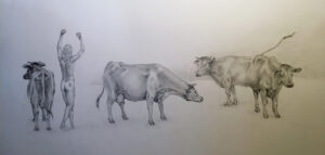 Fleming calls the three pieces from 1980 “a return to where I began.” “Bird and Turtle” depicts the small Carolina town where Fleming grew up. “Cow and Bill” is also from 1980 and depicts a naked man joining a herd of cows.
