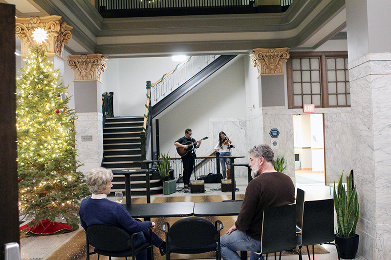 On a Friday evening, live music by Chad Elliott and Kathryn Fox was featured in the building’s atrium, where patrons can bring their drinks.