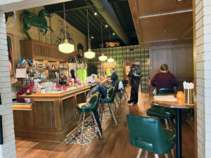 Another unique offering features a ChaCha’s Hiland Bakery donut. The drink, called “Cities in Dust,” mixes vodka, coffee liqueur, orgeat and cream, served on a sugared rim and topped with half a fresh donut. The drink costs $11. Our bartender split it so each of us could try it.