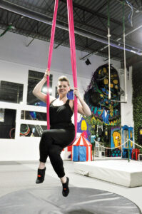 Felicia Coe established Iowa’s first aerial teaching program in 2012. Her circus training facility, Cirque Wonderland, is in Valley Junction. Photo by Sofia Legaspi Dickens