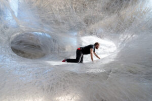 The “Drawing in Space” exhibit came up more than once when asking the installation team about which exhibits were most challenging. Tape was suspended throughout the Art Center, allowing visitors to crawl through it. The exhibit took a team of 14 people two weeks to set up. Meinders, Rosborough, Quick and Ashe all named that as one of the most taxing exhibits they have worked on.