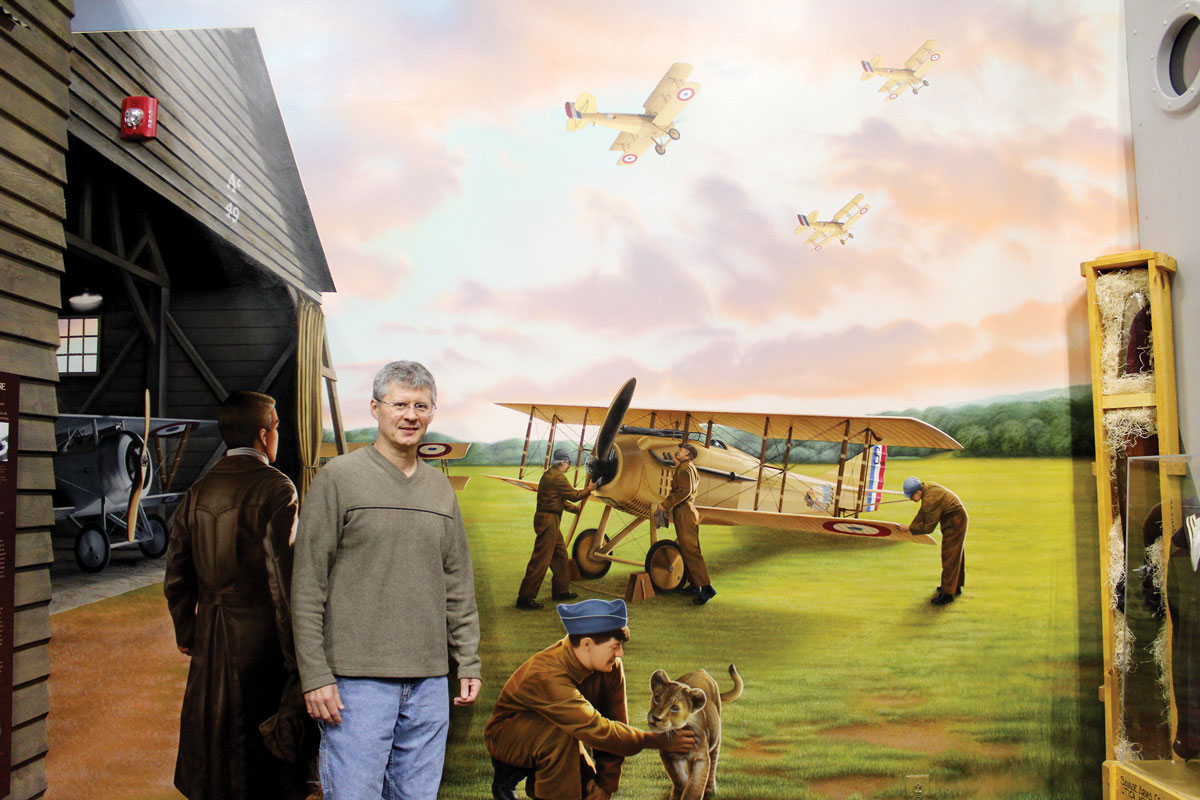 John Neal stands in front of a scene from a WWI French airfield at the Iowa Gold Star Military Museum. Photo by Jackie Wilson