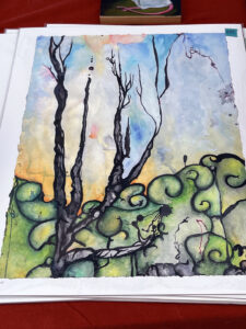 Sarah considers her work fine art, “dabbling” in landscape and still life. Mark’s artwork consists of whimsical storybook-type drawings and characters.