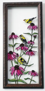 Each painting is unique, as no two paintings or frames are the same. Folks who purchase art display it on walls or windows where the color is transparent. Carlson likes how the clear glass surrounding the painting takes on a fresh dimension, depending on the color of the wall where it is hung.