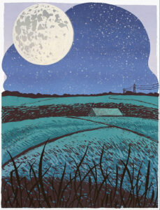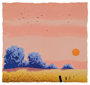 Images of nature find their way into their art pieces. Jonathan says he and Allison gain inspiration anywhere from their travels to their backyard garden. Their latest element is creating glow-in-the-dark prints. Jonathan discovered an ink additive that creates a whimsical glowing artwork.
