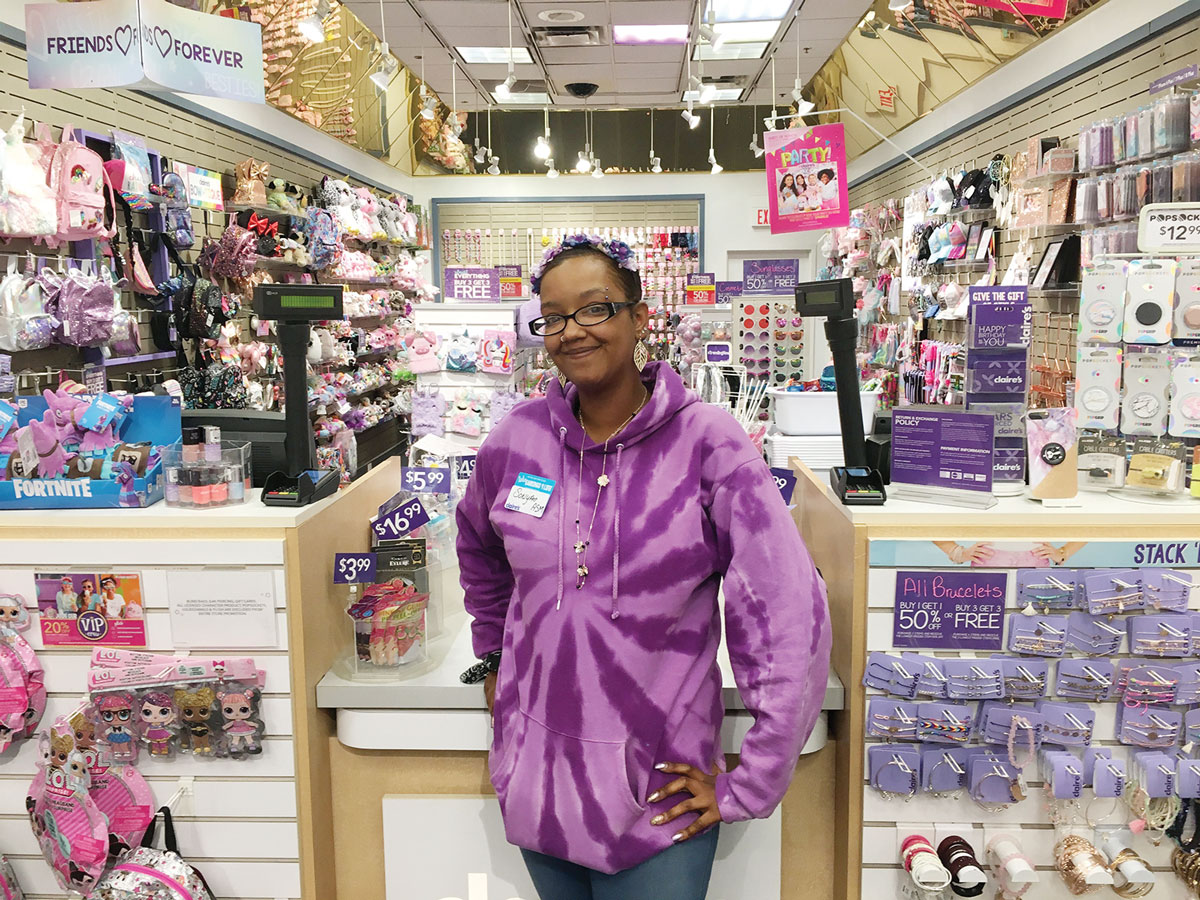 Sonya Rumbly smiles. A wide friendly smile. One that puts me at ease even though I’m surrounded by narrow walls of pink and glitter. Pink-and-glitter purses, pink-and-glitter backpacks, pick-and-glitter necklaces. Claire’s in Merle Hay Mall must be a paradise for 13-year-olds. And me.