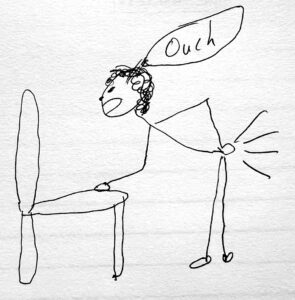 But now I’m having second thoughts about becoming Mr. Jokester. I remember back in law school an old professor would always ask us students to consider “whose ox is being gored?” In other words, who is really paying the price for what happened. Isn’t the person with the knitting needle in their tushy really the one being gored? How dare I make fun of someone else’s pain? Particularly if that someone is my sweetie?