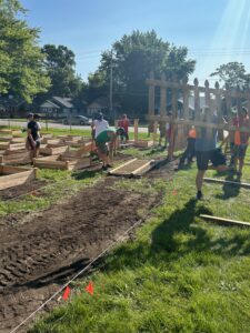 The two groups joined forces on Friday, July 19, to renovate the nonprofit’s existing community garden at 1350 E. Washington Ave., Des Moines. Volunteers assisted with a variety of tasks, including assembling garden beds and a vegetable washing station, filling the garden beds with soil and planting fruit, vegetable and flower seedlings, laying mulch, building a picket fence around the garden, and constructing a compost bin.