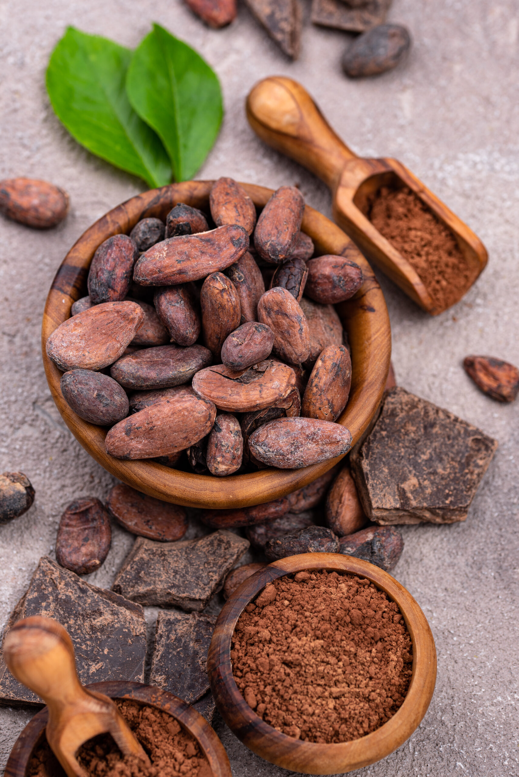 Natural cocoa powder, cocoa beans and pieces of dark chocolate