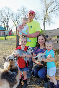 Nicky’s daughters, Remi, 6, and Ellie, 5, enjoy cuddling with the goats. Remi demonstrated walking on a balance-type beam set up for one of the goats, coaxing her along as she climbed up the spool. Nicky says she trusts the girls and goats together.