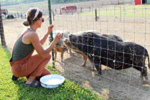 “They love belly rubs. Our biggest is 700 pounds — very massive. But they are the most gentle, kindest pigs we have,” says Kaitie.