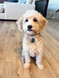 Sylvie, a miniature goldendoodle, looked longingly into my eyes as she jumped up to sit on my lap during our People and Pets interview. Since I couldn’t pet her and take notes, she settled in by my feet instead.
