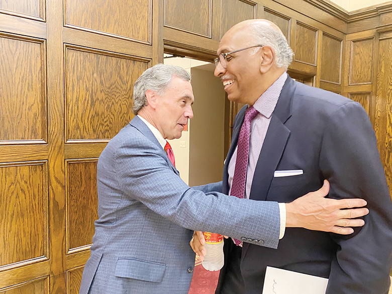 Former Republican Party of Iowa Chairman David Oman (left) speaks with former national GOP chairman Michael Steele of Maryland at Iowa State University. (Photo by Douglas Burns)