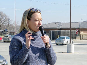Jen Pellant, president of The Western Iowa Labor Federation, addresses a rally in Council Bluffs.