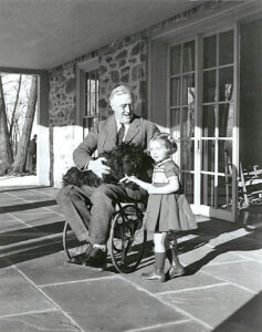 President Franklin D. Roosevelt on the porch at Top Cottage in Hyde Park, New York, with Ruthie Bie and Fala. February 1941. This photograph was taken by his friend, Margaret “Daisy” Suckley. Ruthie Bie (later Bautista), then 3 years old, was the daughter of the property caretakers. Source: Creative Commons/FDR Presidential Library and Museum. Photograph by Margaret Suckley.