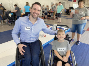 State Rep. Josh Turek talks with then 6-year-old Hayes Hofmeister in Des Moines during a summit on advocacy for people with disabilities. Photo by Douglas Burns